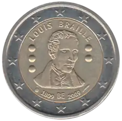 Le portrait de Louis Braille, entre ses initiales L et B écrites dans l'alphabet dont il est l'auteur. Au-dessus du portrait, son nom LOUIS BRAILLE; sous le portrait, l'indication BE du pays émetteur, entre les dates 1809 et 2009. L'anneau externe de la pièce comporte les douze étoiles du drapeau européen.