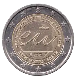 Le logo de la présidence, c'est-à-dire les lettres stylisées EU et trio.be. Au-dessus du dessin, figure l'inscription BELGIAN PRESIDENCY OF THE COUNCIL OF THE EU 2010 (Présidence belge du Conseil de l'UE 2010) et, en dessous, le nom du pays émetteur BELGIE BELGIQUE BELGIEN. Sous le logo se trouve le millésime 2010. L'anneau externe de la pièce comporte les douze étoiles du drapeau européen.