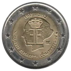 Le logo du Concours Reine Élisabeth, composé d'un double E couronné, est superposé à l'effigie de la Reine Élisabeth, tournée vers la gauche. Au-dessus de l'effigie sont indiquées les années 1937-2012. En dessous de l'effigie figure l'inscription QUEEN ELISABETH COMPETITION (Concours Reine Élisabeth). L'indication du pays émetteur BE (pour Belgique) se trouve à droite de l'effigie. L'anneau externe de la pièce comporte les douze étoiles du drapeau européen.