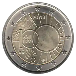 Le nombre 100 dont le premier zéro entoure les sigles KMI (pour Koninklijk Meteorologisch Instituut) et IRM (pour Institut royal météorologique) et le second forme un soleil. À gauche du soleil, on trouve des isobares, des gouttes de pluie et des flocons de neige. En haut de la pièce le millésime 2013 et, en bas, les lettres BE pour le pays émetteur. L'anneau externe de la pièce comporte les douze étoiles du drapeau européen.