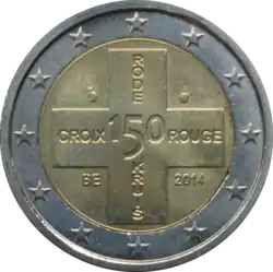Une croix, dans laquelle on peut lire, sur l'axe horizontal CROIX ROUGE, sur l'axe vertical, RODE KRUIS (Croix-Rouge) et au centre 150. En bas à gauche, le nom du pays émetteur en abrégé BE. En bas à droite, le millésime 2014. L'anneau externe de la pièce comporte les douze étoiles du drapeau européen.