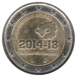 Le logo officiel des commémorations du centenaire de la Première Guerre mondiale en Belgique, composé des dates 2014-18 dont la texture du 20 est différente du reste, surmontées d'un coquelicot stylisé et surmontant le texte anglais The Great War Centenary (Le centenaire de la grande Guerre). La mention trilingue du pays émetteur est indiquée en haut à gauche BELGIE-BELGIQUE-BELGIEN. L'anneau externe de la pièce comporte les douze étoiles du drapeau européen.