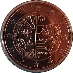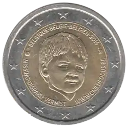 Visage de Liam Vanden Branden, enfant de 2 ans disparu en 1996 et jamais retrouvé[32]. À gauche, la légende trilingue MISSING-DISPARU-VERMIST. À droite l'URL du site de l'organisation non gouvernementale Child FocusWWW.CHILDFOCUS.BE. En haut la mention trilingue du pays émetteur BELGIQUE•BELGIE•BELGIEN. L'anneau externe de la pièce comporte les douze étoiles du drapeau européen.