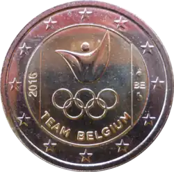 Logo de l'équipe olympique belge, composé d'un athlète stylisé portant le drapeau belge sur les épaules, au-dessus des anneaux olympiques et de la légende en anglais TEAM BELGIUM (équipe Belgique). À gauche, à la verticale, le millésime 2016. À droite, la mention du pays émetteur BE. L'anneau externe de la pièce comporte les douze étoiles du drapeau européen.