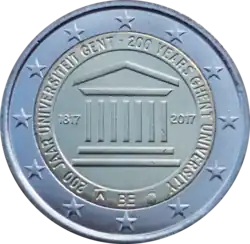 Le logo de l'Université de Gand dans un cercle au-dessus des années 1817-2017. Le long du cercle la légende bilingue 200 JAAR UNIVERSITEIT GENT - 200 YEARS GHENT UNIVERSITY (200 ans Université de Gand). En bas, la mention abrégée du pays émetteur BE. L'anneau externe de la pièce comporte les douze étoiles du drapeau européen.