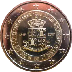 L'écusson couronné de l'Université de Liège dans un cercle et entouré des années 1817 et 2017. Le long du cercle la légende en français et en anglais 200 ANS UNIVERSITE DE LIEGE - 200 YEARS UNIVERISTY OF LIEGE. En bas, la mention abrégée du pays émetteur BE. L'anneau externe de la pièce comporte les douze étoiles du drapeau européen.