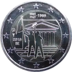 Représentation stylisée de deux étudiants, l'un brandissant des tracts, l'autre un drapeau, devant un amphithéâtre. En haut, la légende bilingue mei et mai l'un au-dessus de l'autre suivi de • 1968. Au gauche des deux étudiants, le millésime 2018 au-dessus de la mention du pays émetteur en abrégé BE. L'anneau externe de la pièce comporte les douze étoiles du drapeau européen.