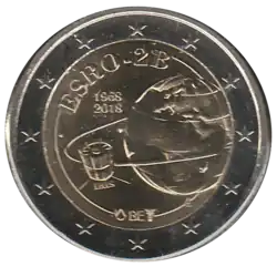 Le satellite artificiel ESRO 2B en orbite autour de la Terre. La Terre située à droite du satellite montre les continents européen et africain. En haut, à gauche, le nom du satellite ESRO-2B et les années 1968 et 2018 l'une en dessous de l'autre. En bas, la mention du pays émetteur en abrégé BE. L'anneau externe de la pièce comporte les douze étoiles du drapeau européen.