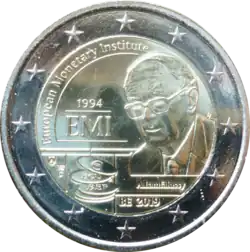 Effigie d'Alexandre Lamfalussy (1929-2015), premier président de l'Institut monétaire européen, sous laquelle est indiquée son nom A. Lamfalussy. En bas, à gauche, 4 pièces de monnaie stylisées. De haut en bas, elles portent le signe € (pour l'euro), le sigle ECU (pour la European Currency Unit, ancêtre de l'euro) et le code ISO BEF (pour le franc belge). La dernière pièce ne comporte aucun texte. Au-dessus des pièces, le sigle EMI (pour European Monetary Institute) surmonté de l'année de création 1994. En haut à gauche, le nom de l'institut en anglais European Monetary Institute. En bas, la mention du pays émetteur en abrégé BE et le millésime 2019. L'anneau externe de la pièce comporte les douze étoiles du drapeau européen.