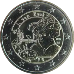 Buste de Jan van Eyck d'après son autoportrait présumé L'Homme au turban rouge, accompagné d'une palette de peintre. À gauche, la signature latine de l'artiste. En haut à gauche, son nom J. van Eyck. À droite, le millésime 2020 au-dessus de la mention du pays émetteur BE. L'anneau externe de la pièce comporte les douze étoiles du drapeau européen.