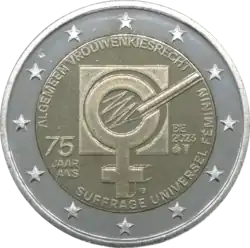 Au centre, le dessin montre une case d’un bulletin de vote, qu’un crayon est en train de griser. À la case grisée se superpose le symbole de Vénus. La mention «75 JAAR ANS» figure dans la partie inférieure gauche, à côté de l’image centrale. Des inscriptions en néerlandais et en français entourent également l’image centrale: «ALGEMEEN VROUWENKIESRECHT» – «SUFFRAGE UNIVERSEL FÉMININ». Les pièces devant être frappées par la Monnaie royale des Pays-Bas, la marque d’atelier de l’Hôtel des monnaies d’Utrecht (un caducée de Mercure) apparaît sur le côté droit de la pièce; elle est accompagnée de la marque du maître belge (une fleur d’aster devant une fiole Erlenmeyer) ainsi que du code pays «BE» et du millésime «2023».