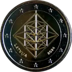 Le dessin représente la forme traditionnelle du module qui compose la décoration de Noël traditionnelle, à savoir un octaèdre, formé de 12 tiges reliées entre elles et symbolisant les 12 mois de l'année. En bas à gauche est inscrit le nom du pays d’émission: «LATVIJA». En haut à droite figure l’année d’émission de la pièce, à savoir «2024».
