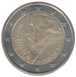 - ↑ JO C 125/09 du 22/05/2008 : Slovénie 2008 (500e Anniversaire de Primož Trubar).