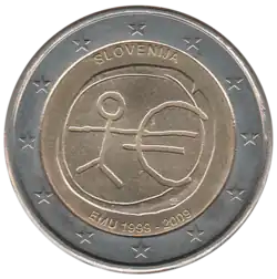 Tous les pays de la zone euro ont émis le 1er janvier une pièce commémorative de 2 € pour célébrer le 10e anniversaire de l'Union économique et monétaire. Le centre de la pièce illustre une silhouette humaine stylisée dont le bras gauche est prolongé par le symbole de l'euro. Le nom du pays émetteur SLOVENIJA apparaît dans la partie supérieure, tandis que l'indication 1999-2009 et l'acronyme EMU (pour Ekonomska in monetarna unija, Union économique et monétaire ou UEM) apparaissent dans la partie inférieure. L'anneau externe de la pièce représente les douze étoiles du drapeau européen. | ||||||