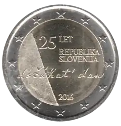 - ↑ JO C 97/08 du 12/03/2016 : Slovénie 2016 (le 25e anniversaire de l’indépendance de la République de Slovénie).