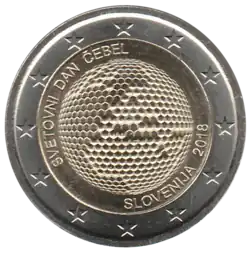 Nid d'abeilles en forme de Globe terrestre formé d'alvéoles hexagonales dont certaines sont bouchées de façon à faire apparaître l'hémisphère est et, notamment, la carte de l'Europe et d'une partie de l'Afrique. En haut, à gauche, la légende SVETOVNI DAN ČEBEL (Journée de l'abeille). En bas, à droite, la mention du pays émetteur SLOVENIJA et le millésime 2018. L'anneau externe de la pièce comporte les douze étoiles du drapeau européen.