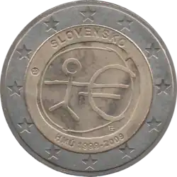 Tous les pays de la zone euro ont émis le 1er janvier une pièce commémorative de 2 € pour célébrer le 10e anniversaire de l'Union économique et monétaire. Le centre de la pièce illustre une silhouette humaine stylisée dont le bras gauche est prolongé par le symbole de l'euro. Le nom du pays émetteur SLOVENSKO apparaît dans la partie supérieure, tandis que l'indication 1999-2009 et l'acronyme HMÚ (pour Hospodárska a menová únia, Union économique et monétaire ou UEM) apparaissent dans la partie inférieure. L'anneau externe de la pièce représente les douze étoiles du drapeau européen. | ||||||
