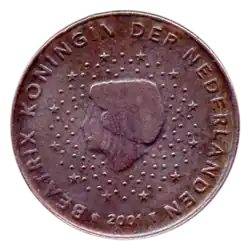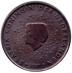 - Pièces de 1 à 50 centimes : L'effigie stylisée de Beatrix, Reine des Pays-Bas, tournée vers la gauche et entourée de points et des 12 étoiles du drapeau européen. Le pourtour reprend la légende BEATRIX KONINGIN DER NEDERLANDEN (Beatrix Reine des Pays-Bas), complétée en bas par le millésime.