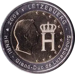 À gauche, l'effigie du grand-duc Henri, regardant à droite, et sur la droite, son monogramme (la lettre H surmonté d'une couronne). Les douze étoiles européennes apparaissent en demi-cercle à la droite du monogramme. Le millésime 2004 et le nom du pays émetteur LËTZEBUERG sont inscrits en cercle au sommet de l'anneau. Les mots HENRI - Grand-Duc de Luxembourg apparaissent en bas de l'anneau.
