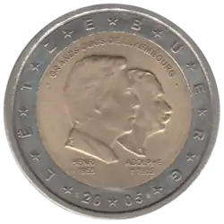 Les effigie conjointes du Grand-Duc Henri et du Grand-Duc Adolphe regardant vers la droite. Ces effigies sont surmontées de la légende, inscrite en demi-cercle, GRANDS-DUCS DE LUXEMBOURG. Les textes HENRI * 1955 et ADOLPHE + 1905 figure sous leurs effigies respectives. Le millésime 2005 est inscrit en dessous. L'anneau externe de la pièce comporte les douze étoiles du drapeau européen placées entre les lettres du nom du pays émetteur LËTZEBUERG.