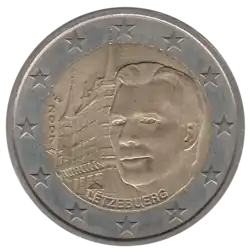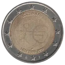 Tous les pays de la zone euro ont émis le 1er janvier une pièce commémorative de 2 € pour célébrer le 10eanniversaire de l'Union économique et monétaire. Le centre de la pièce illustre, en filigrane, alternativement une silhouette humaine stylisée dont le bras gauche est prolongé par le symbole de l'euro ou l'effigie du Grand-Duc Henri[N 1]. Le nom du pays émetteur LËTZEBUERG apparaît dans la partie supérieure, tandis que l'indication 1999-2009 et l'acronyme UEM (pour Union économique et monétaire) apparaissent dans la partie inférieure. L'anneau externe de la pièce représente les douze étoiles du drapeau européen.