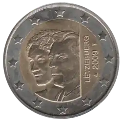 Sur le côté gauche de son anneau interne, la pièce représente l'effigie de son Altesse royale le Grand-Duc Henri superposée à l'effigie de la Grande-Duchesse Charlotte, tous deux tournés vers la gauche. Le texte «LËTZEBUERG», aligné verticalement, et le millésime «2009», encadré par la marque du maître et la marque d'atelier, apparaissent sur le côté droit de l'anneau interne de la pièce. L'anneau externe de la pièce comporte les douze étoiles du drapeau européen.