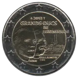 Les effigies conjointes du Grand-Duc Henri et de son aïeul le Grand-Duc Guillaume IV, tournées vers la droite, devant une vue de la ville de Luxembourg. La légende GRANDS-DUCS DE LUXEMBOURG et le millésime 2012 apparaissent au-dessus des effigies. Le nom HENRI apparaît sous l'effigie du grand-duc actuel et le nom GUILLAUME IV ainsi que le texte † 1912 apparaît sous l'effigie de ce dernier. L'anneau extérieur de la pièce comporte les douze étoiles du drapeau européen.
