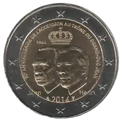Les effigies des Grands-Ducs Jean et Henri tournées vers la gauche et surmontées d'une couronne. Sous chaque effigie, leurs noms: Jean et Henri, et le millésime 2014. Au-dessus de l'effigie du Grand-Duc Jean: l'année de son accession au trône: 1964. Le tout est entouré de la légende 50eANNIVERSAIRE DE L'ACCESSION AU TRÔNE DU GRAND-DUC JEAN. L'anneau externe de la pièce comporte les douze étoiles du drapeau européen.
