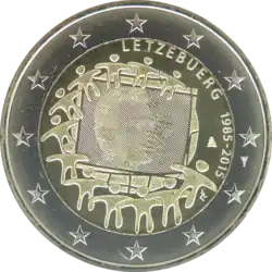 Le drapeau européen dessiné grossièrement, entouré par douze bonshommes stylisés et comportant un hologramme permettant de faire apparaître alternativement le drapeau ou l'effigie du Grand-Duc Henri. En haut à droite, le nom du pays émetteur LËTZEBUERG suivi des années 1985-2015. L'anneau externe de la pièce comporte les douze étoiles du drapeau européen.
