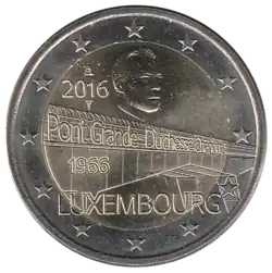 La représentation du Pont Grande-Duchesse Charlotte, à Luxembourg, sur lequel est placée la légende Pont Grande-Duchesse Charlotte et, en dessous l'année de sa construction 1966. En haut, l'effigie du Grand-Duc Henri, tournée légèrement vers la droite. À sa gauche, le millésime 2016. En bas, la mention du pays émetteur en français LUXEMBOURG. L'anneau externe de la pièce comporte les douze étoiles du drapeau européen.