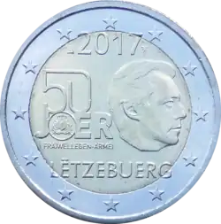 À gauche, le logo de l'anniversaire composé du texte 50 JOER FRAÏWËLLEGEN-ARMÉI (50 ans armée volontaire). À l'intérieur du O de JOER, les armoiries de l'armée luxembourgeoise. À droite, l'effigie orientée vers la droite du Grand-Duc Henri. L'anneau externe de la pièce comporte les douze étoiles du drapeau européen.