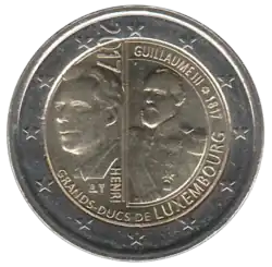 Le centre de la pièce est séparé en deux par une ligne verticale. À gauche de la ligne, l'effigie du Grand-Duc Henri tourné vers la gauche, son nom HENRI en bas et le millésime 2017 en haut. À droite, le buste du Grand-Duc Guillaume III en uniforme, tourné légèrement vers la gauche. En haut, en arc de cercle, son nom GUILLAUME III suivi d'une étoile et de son année de naissance 1817. En bas, en dessous des deux effigies, la légende GRANDS-DUCS DE LUXEMBOURG. L'anneau externe de la pièce comporte les douze étoiles du drapeau européen.