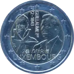 À gauche, le buste du Grand-Duc et Roi des Pays-Bas Guillaume Ier. À droite, le buste du Grand-Duc Henri tourné vers la gauche. Entre les deux visages, à la verticale, empiétant sur l'anneau externe, le nom GUILLAUME Ier et ses années de naissance et de mort 1772-1843. En bas, sous les deux bustes, la mention du pays émetteur LUXEMBOURG surmontée du millésime 2018. L'anneau externe de la pièce comporte les douze étoiles du drapeau européen.