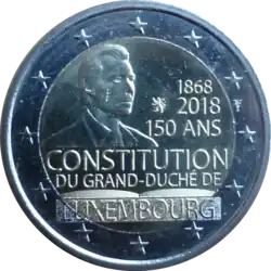 Buste du Grand-Duc Henri, légèrement tourné vers la droite, au-dessus d'un livre ouvert, vu latéralement. À droite du Grand-Duc, les années 1868-2018 en deux lignes et la mention 150 ANS. Au-dessus du livre, le début de la légende CONSTITUTION DU GRAND-DUCHÉ DE (en deux lignes). En dessous du livre, la fin de la légende mentionnant le pays émetteur LUXEMBOURG. L'anneau externe de la pièce comporte les douze étoiles du drapeau européen.