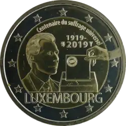Buste du Grand-Duc Henri, légèrement tourné vers la droite, à côté d'une urne dans laquelle une main introduit un bulletin de vote. En haut, la légende Centenaire du suffrage universel et les années 1919- 2019. En bas, la mention du pays émetteur LUXEMBOURG. L'anneau externe de la pièce comporte les douze étoiles du drapeau européen.