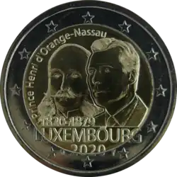 Effigies conjointes du Prince Henri d'Orange-Nassau et du Grand-Duc Henri. À gauche, la légende Prince Henri d'Orange-Nassau. Sous les effigies, la mention du pays émetteur LUXEMBOURG, au-dessus du millésime 2020.