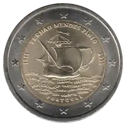 La représentation d'un voilier naviguant sur une mer formée de mots faisant référence au Portugal, à Lisbonne, au livre de Fernão Mendes Pinto et à certaines destinations de ses voyages. Le nom du pays émetteur PORTUGAL est inscrit en dessous; celui de l'explorateur, FERNÃO MENDES PINTO, entouré des années 1511 et 2011, apparaît en haut. L'anneau externe de la pièce comporte les douze étoiles du drapeau européen.