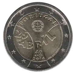 Sur un œillet stylisé, la date du 25 DE ABRIL (25 avril), sous l'écusson du Portugal et au-dessus de la légende 40 ANOS (40 ans), en 2 lignes. En haut de la pièce, la mention du pays émetteur PORTUGAL. En bas, au centre, le millésime 2014 . L'anneau externe de la pièce comporte les douze étoiles du drapeau européen.