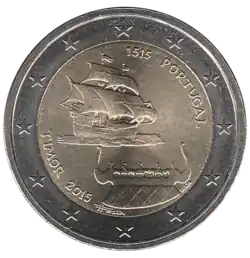 La représentation d'un bateau du XVIesiècle naviguant sur la mer. En bas de la pièce figure le toit de chaume d'une maison traditionnelle du Timor ornée d'une sculpture en bois évoquant bateaux et chevaux. En haut, à droite, l'année 1515 et le nom du pays émetteur PORTUGAL. En bas, à gauche, le pays commémoré TIMOR et le millésime 2015. L'anneau externe de la pièce comporte les douze étoiles du drapeau européen.