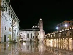 La Piazza del Popolo de Ascoli Piceno, dans les Marches, est une place entourée de monuments gothiques et de la Renaissance, fermée par des galeries d'arcades.