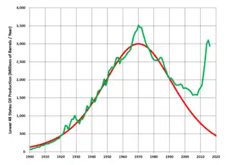 Marion King Hubbert est le premier géologue à formaliser en 1956 une théorie du pic pétrolier en se focalisant sur la production américaine (pic de Hubbert)[6],[7].
