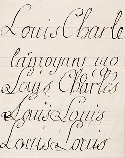 - Sont récemment passés en vente[8] deux feuillets d’écriture de Louis XVII, tracés vers 1790-1791, avec les mots « Louis, Charles, larmoyant » (155 x 195 mm). Cet essai montre un mot sur lequel des guides des hampes ont été tracés au crayon, probablement par Sourdon Dumesnil de Saint-Cyr. Ce document provient de la collection de Prosper Tarbé (1809-1871), dont le gros fut donné à la ville de Reims.