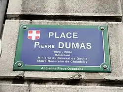 Médaille de la Résistance française par décret du 3 janvier 1946[2].- Le , le conseil municipal de Chambéry a donné le nom de Pierre Dumas à l'ancienne place Octogone.