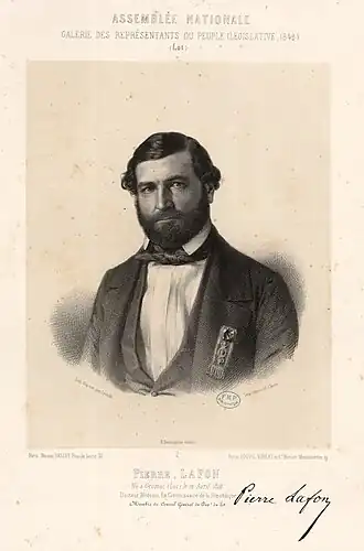 Pierre Lafon est un homme politique français né le à Gramat (Lot) et décédé le 1er juillet 1880 (Lieu de décès inconnu)[1].