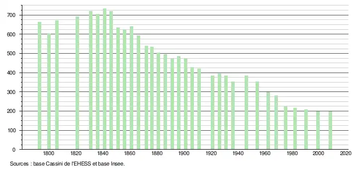 - ↑ Dans le tableau des recensements et le graphique, par convention dans Wikipédia, le principe a été retenu, pour les populations légales postérieures à 1999 de n’afficher dans le tableau des recensements et le graphique que les populations correspondant à l'année 2006, première population légale publiée calculée conformément aux concepts définis dans le décret no 2003-485 du 5 juin 2003, et les années correspondant à une enquête exhaustive de recensement pour les communes de moins de 10 000 habitants, ainsi que la dernière population légale publiée par l’Insee.