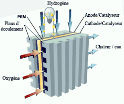 Une pile à combustible PEM est constituée d'un "stack" (empilement), d'un compresseur, d'un humidificateur, d'un détendeur, d'un système de refroidissement et d'une carte électronique pour le pilotage.