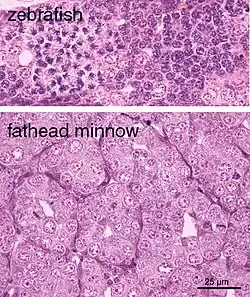 - ↑ Kathleen M. Jensen, Joseph J. Korte, Michael D. Kahl et Mumtaz S. Pasha, « Aspects of basic reproductive biology and endocrinology in the fathead minnow (Pimephales promelas) », Comparative Biochemistry and Physiology Part C: Toxicology & Pharmacology, vol. 128, , p. 127–141 (DOI 10.1016/S1532-0456(00)00185-X, lire en ligne, consulté le )