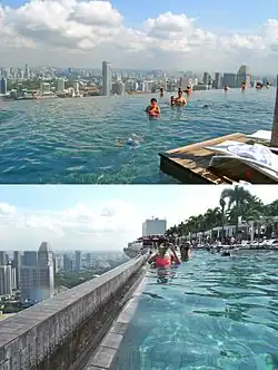 Une piscine à débordement est un type de piscine ou de miroir d'eau conçu pour donner l'illusion que la piscine fait partie à part entière du bassin où elle se trouve. Sur une face avec une vue dégagée sur l'horizon, l'eau débordant du bassin principal est récupérée en contrebas dans une gouttière d'évacuation, les bordures du bassin étant masquées. Jusqu'à un tiers plus cher qu'une piscine traditionnelle, ce type de piscine est souvent associé au luxe.