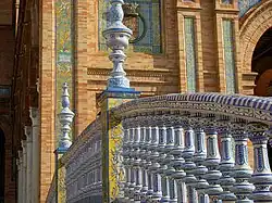 Il est construit en brique, en marbre et est décoré de céramique peinte. Son style est un mélange néorenaissance, gothique et mudéjar. Des bancs et des ornements en céramique peinte (azulejos) sont adossés aux deux ailes. Ils représentent, par ordre alphabétique, les 48 provinces d'Espagne qui existaient à l'époque (les enclaves africaines de Ceuta et de Melilla ont plus tard été respectivement détachées des provinces de Cadix et d'Almería pour former des villes autonomes). Chaque province a sa carte, le blason de sa capitale et des mosaïques représentant une scène de son histoire[1]. Parmi les scènes représentées dominent des épisodes historiques liés à la Reconquista, à la découverte du continent américain et à la guerre d’Indépendance[2].