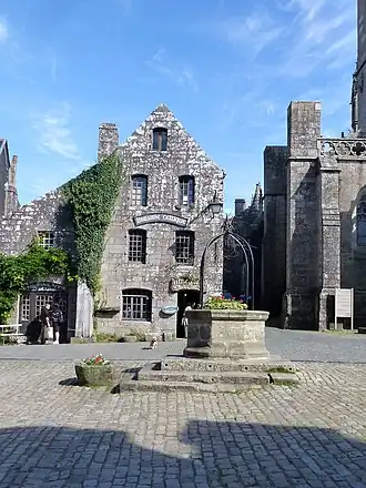 La place de l'Église et le puits communal de Locronan. | |